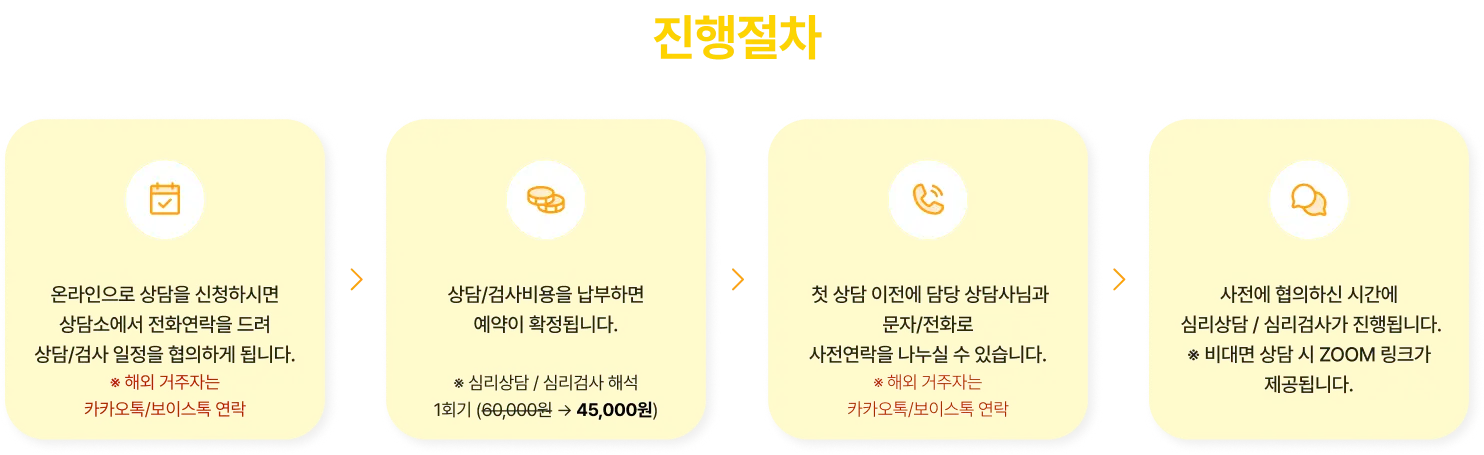 · 1회기당 비용은 60,000원(현재 할인가 45,000원)입니다. 매 정각부터 50분 간 진행됩니다. · 정기 상담시간으로 레몬카운슬러 및 상담사와 협의한 요일/시간에 매주 동일하게 상담이 진행됩니다. · 첫 상담 이후 다음 회기는 한 주 뒤 같은 시간에 진행되며, 상담사님과 협의하신 다른 일정을 선택하여 예약을 하실 수도 있습니다. · 비용은 카드결제 / 계좌이체 모두 가능합니다. · 일정 연기는 상담예정시간 24시간 전까지 가능합니다. (24시간 이내에 일정 연기 희망 시 다음 상담 비용을 납부하셔야 합니다. – 천재지변, 상담사 사유 제외) · 2회 연속으로 상담 일정 연기는 제한됩니다. (두 번째로 일정을 연기하실 때는 다음 상담비용을 납부하셔야 연기가 가능합니다 – 천재지변, 상담사 사유 제외)